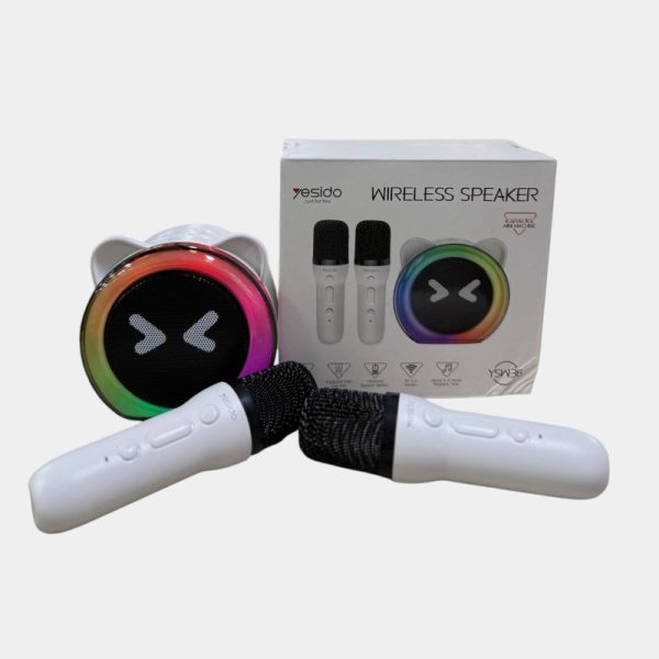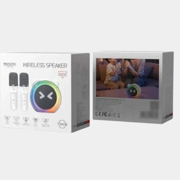 Yesido YSW36 — компактная Bluetooth-колонка формата «карате-станция» с двумя беспроводными микрофонами в комплекте. Модель ориентирована на сценарии «включил и поёшь»: связь со смартфоном по Bluetooth 5.3, воспроизведение с USB-флешки и TF-карты, а также проводной вход AUX — всё это позволяет быстро выбрать источник фонограммы без дополнительного оборудования. Цветная LED-подсветка добавляет визуальный эффект для домашних мини-вечеринок, детских праздников и семейных сборов.