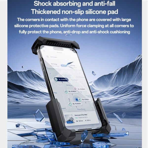 Рабочая часть держателя оснащена поворотным узлом, благодаря которому можно ориентировать устройство под удобным углом в зависимости от посадки и дорожной ситуации. Такой формат установки на переднюю стойку позволяет удерживать экран в зоне видимости, не перегружая рулевую область дополнительными элементами. Материал исполнения — ABS-пластик — указан производителем как базовый; внешний вид и фактура соответствуют типовой конструкции аксессуаров данного класса. Зажимной тип крепления обеспечивает прижим держателя к стойке в пределах, предусмотренных конструкцией.