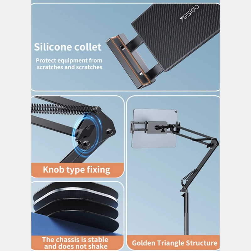 Yesido C295 — многофункциональный монопод для селфи форм-фактора напольного держателя: конструкция рассчитана на установку на пол и устойчивое размещение смартфонов и планшетов в пределах заявленной нагрузки до 1000 г. Фиксация устройства выполняется цанговым (пружинным) зажимом, который прижимает корпус по центру и позволяет быстро устанавливать и снимать девайс без инструментов. Узел крепления поддерживает поворот, что даёт возможность оперативно менять ориентацию и ракурс в пределах механического хода — для съемок, видеосвязи, презентаций или длительного просмотра контента.