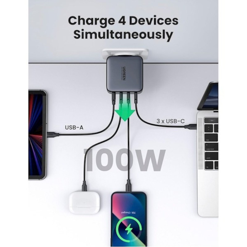 UGREEN CD226 (арт. 90575) — это высокопроизводительное сетевое зарядное устройство нового поколения, созданное на базе технологии GaN (нитрид галлия), которая обеспечивает более высокую эффективность, компактные размеры и минимальный нагрев даже при длительной работе. Зарядка оснащена четырьмя портами — тремя USB-C и одним USB-A, что позволяет одновременно подключать несколько устройств, в том числе смартфоны, планшеты, ноутбуки и различную портативную электронику.