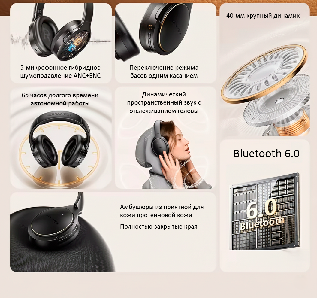 Беспроводная Технология: Наушники поддерживают беспроводную связь Bluetooth 5.3 и 6.0 с широким рабочим диапазоном 10-20 метров.