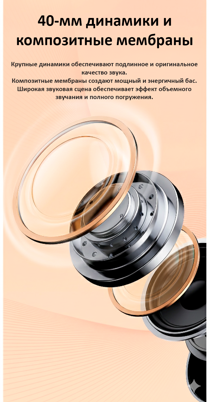 Мощные Динамики: Внутри установлены 40 мм рупоры и композитные диафрагмы. Эта комбинация обеспечивает аутентичное и оригинальное качество звука с энергичным басом и обширным звуковым полем, создавая захватывающее объемное стерео.