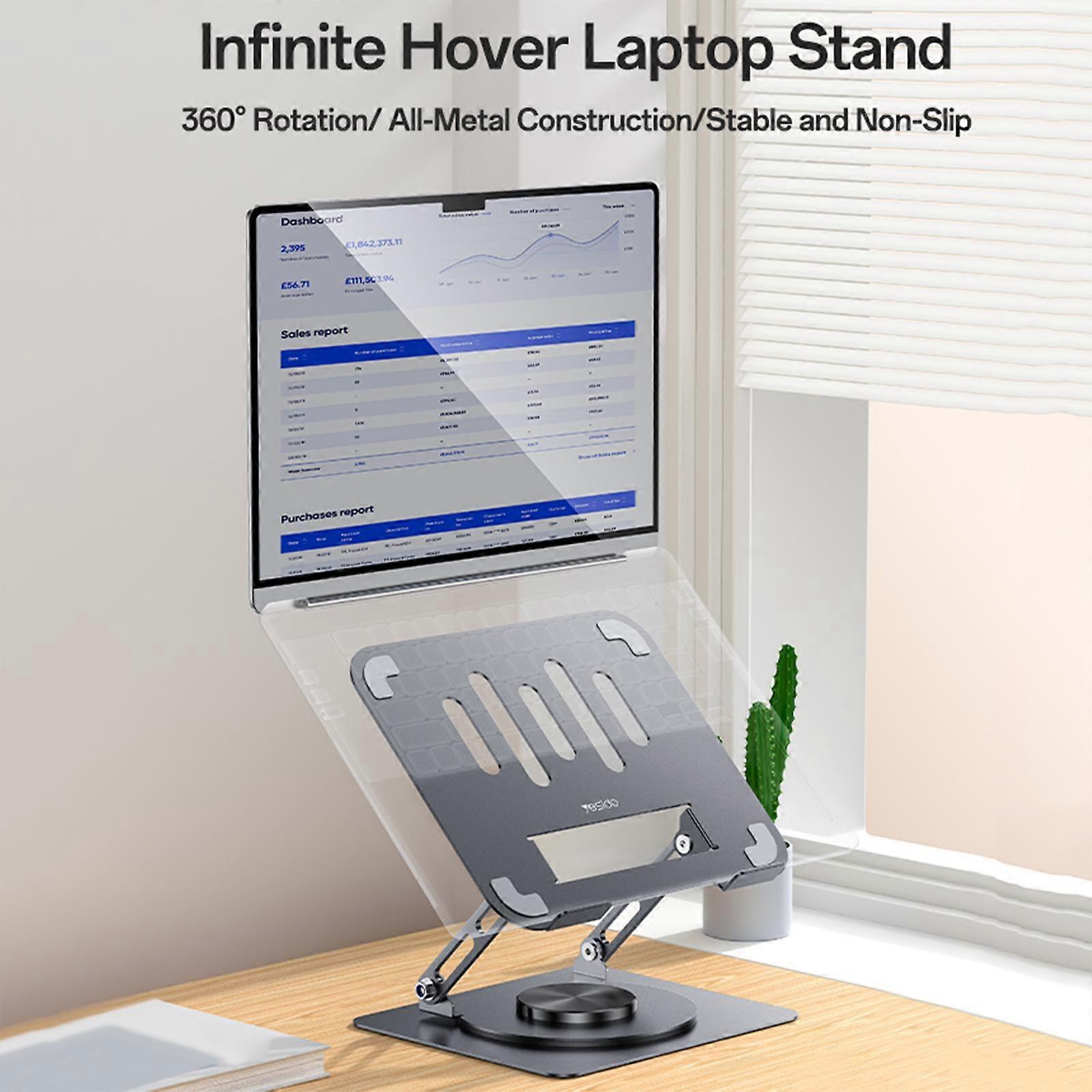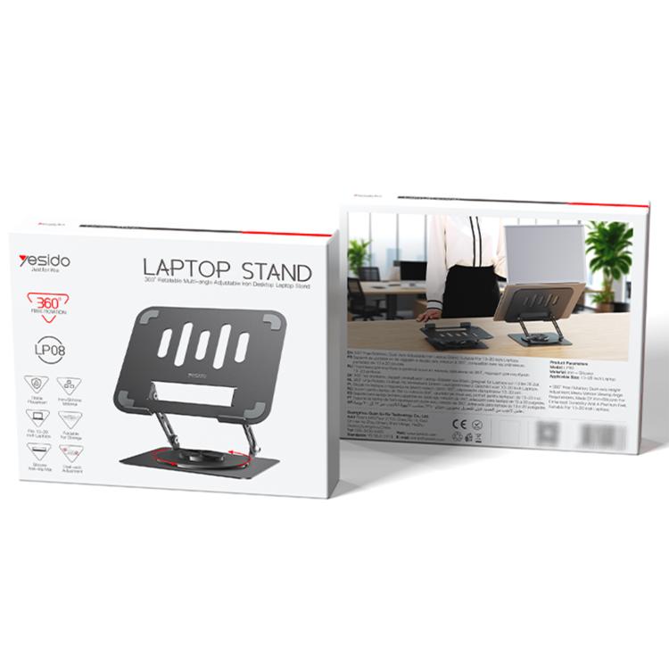 Yesido LP08 — регулируемая настольная подставка для ноутбука, созданная для гибкой настройки рабочего места. Модель оснащена поворотным основанием на 360° (free rotation), поэтому экран и клавиатуру можно разворачивать в нужную сторону без перестановки всей подставки. Двойная ось позволяет изменять угол наклона и фиксировать положение под разные сценарии: работа с текстом, обучение, просмотр материалов или общение. Платформа имеет прорези, а также опорные элементы с силиконовыми накладками — это помогает держать устройство устойчиво и уменьшает скольжение на столе. По информации на упаковке, подставка рассчитана на ноутбуки 13–20 дюймов и выполнена из сочетания железа и силикона.
