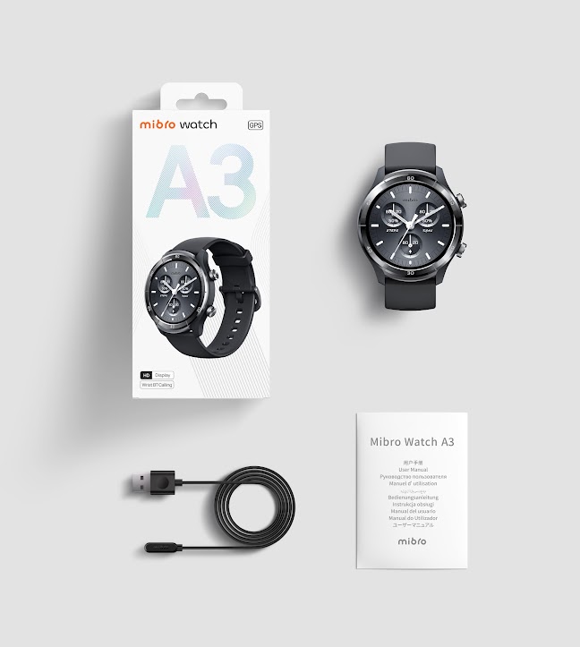 Комплектация: смарт-часы Mibro Watch A3, зарядный кабель, руководство пользователя, оригинальная упаковка. Руководство содержит порядок включения, первичной настройки и подключения к телефону.