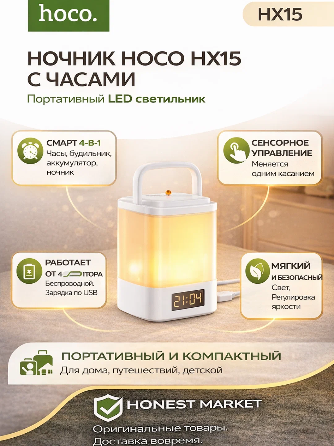 HOCO HX15 — аккумуляторный ночник, рассчитанный на использование в качестве компактного источника мягкого света. Корпус выполнен из ABS-пластика, а мощность светового источника составляет 1,5 Вт.
