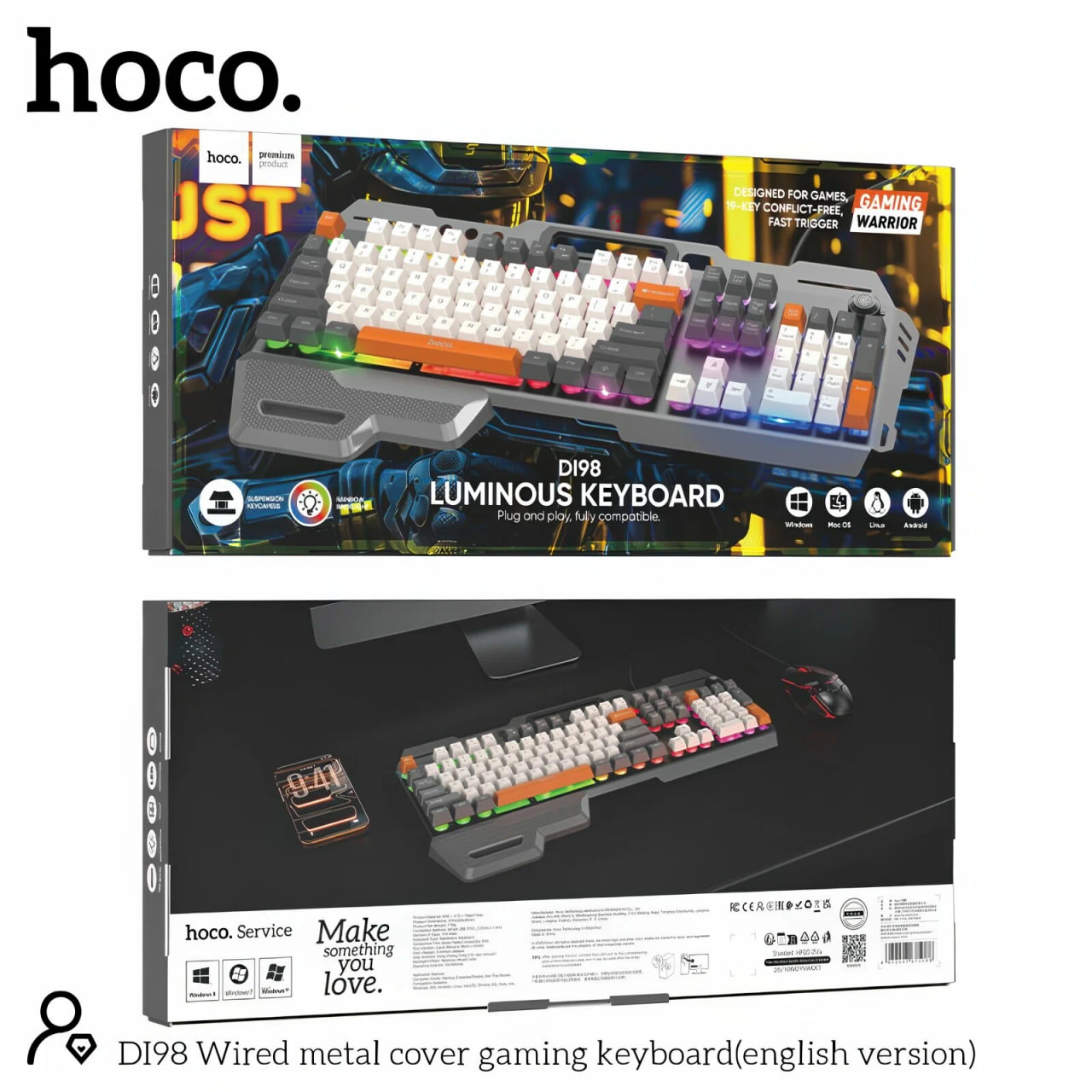 HOCO DI98 — проводная игровая клавиатура из линейки Luminous Keyboard. По маркировке на упаковке модель относится к категории «Gaming warrior» и ориентирована на игровые сценарии, где важна стабильная регистрация нажатий и быстрый отклик. На коробке указано «Designed for games», а также заявлены «19-key conflict-free» и отметка «Fast trigger». Это означает одновременную обработку до 19 нажатий без конфликтов (anti-ghosting в пределах заявленного количества клавиш) и акцент на быстром срабатывании.