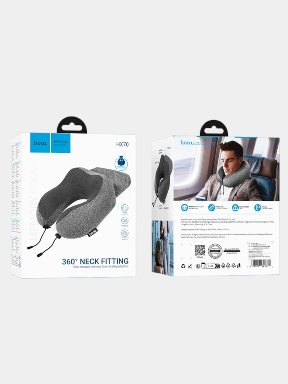 Модель HOCO HX70 относится к серии premium product, что подчёркнуто на упаковке. В комплекте предусмотрен мешок для хранения, благодаря которому подушку удобно брать с собой и хранить в багаже или сумке.